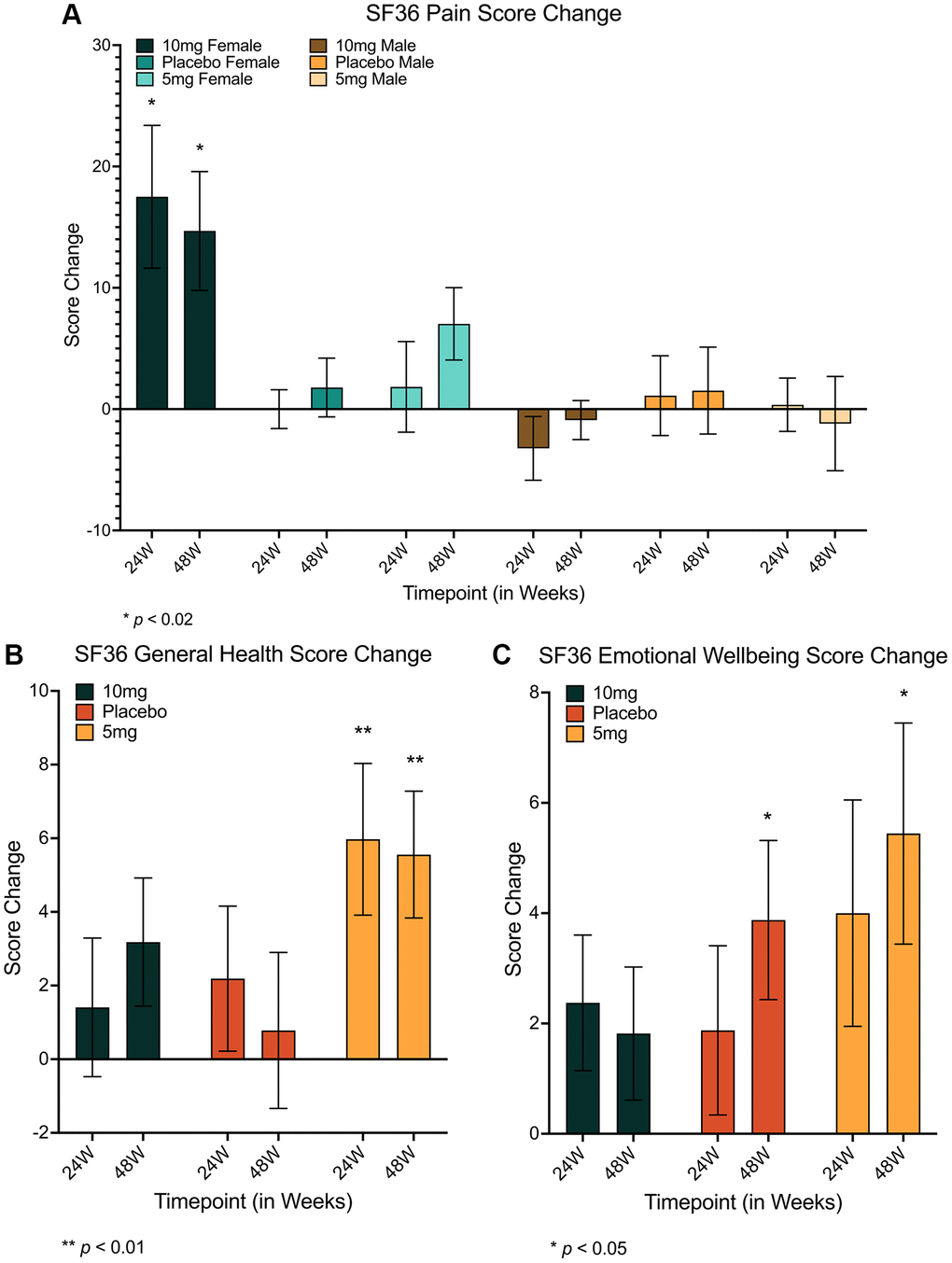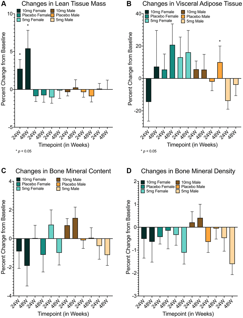Subsequent simplified analysis (following multiple statistical approaches detailed in Supplementary Table 4) of DXA-based body composition changes at 24 and 48 weeks by dosing group suggested significant differences only in the secondary endpoint of LTM for females across dosing groups after both 24 and 48 weeks (24w: F(2, 36) = 4.208, p = 0.023, ε2 = 0.144; 48w: F(2, 30) = 5.052, p = 0.013, ε2 = 0.202), with Bonferroni-corrected post-hoc analyses suggesting the 10 mg group had significant increases in at both timepoints relative to both placebo and 5 mg groups (placebo −24w: md = 3.60472 (95% CI = 0.0913–7.1182), p = 0.043; 48w: md = 6.194 (95% CI = 0.8773–11.5105), p = 0.018; 5 mg–24 w: md = 3.774 (95% CI = 0.3271–7.2212), p = 0.028; 48w: md = 5.565 (95% CI = 0.5311–10.5979), p = 0.026; Table 2, Figure 1A, Supplementary Figures 3A–H and 4A). Interestingly, no significant differences were found for the primary end point of VAT after 48 weeks for either gender (Table 2, Supplementary Table 4, Figure 1B and Supplementary Figure 4B), or for the secondary end point of BMC after 48 weeks (Table 2, Figure 1C, 1D and Supplementary Figure 4C, 4D). While surprising, limited sample sizes and variability in individual response (Supplementary Figure 3E–3H) likely restricted the statistical interpretation of results for this trial cohort.