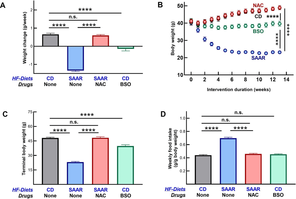 NAC supplementation reversed all SAAR effects, i.e., CD and NAC mice had similar body weights, growth rates, and food consumption (Figure 1A–1D). Morphometric changes in BSO mice were in the same direction as in the SAAR mice but with a smaller effect size. Compared to the baseline, BSO mice neither lost nor gained body weight during the study (Figure 1A, 1B). However, due to the weight gain in CD mice, the terminal body weights in the BSO mice (39.73±1.33) were 81% of that in CD mice (48.09±0.81g, Figure 1C). Unlike the SAAR diet, BSO did not increase food intake (Figure 1D).