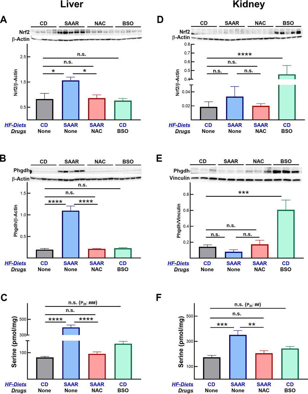 The SAAR diet and BSO exerted tissue-specific effects on GSH, Nrf2, and Phgdh. While both interventions lowered hepatic and renal GSH levels, their effects on Nrf2 and Phgdh were exclusive to one tissue. This tissue-specific effect could be due to the low threshold requirement. The magnitude of GSH decrease was higher in the livers than in the kidneys of the SAAR mice, while the vice versa was true for BSO mice (p < 0.0001). Consequently, the SAAR diet upregulated Nrf2 and Phgdh exclusively in the liver, whereas BSO triggered these responses only in the kidney. One possible reason for the high sensitivity of kidneys to BSO could be the method of administration. Prior research reported higher sensitivity of kidneys than the liver to BSO administered in water and that these two tissues respond differently even to intraperitoneal injection of BSO [42, 43]. Furthermore, it is well-established that hepatic GSH concentrations fluctuate significantly throughout the day, whereas renal GSH levels remain relatively stable [44]. It is also known that the Nrf2 expression itself fluctuates due to circadian rhythms [45–47]. A combination of these factors could contribute to the apparent lack of BSO effect on hepatic Nrf2 and Phgdh.
