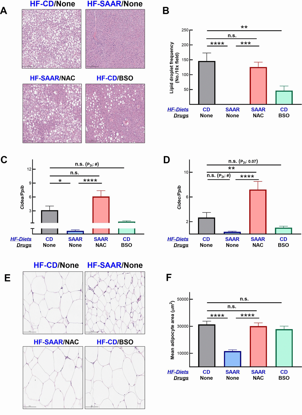 As expected, the SAAR diet strongly decreased hepatic lipid droplet frequency (Figure 4A, 4B). The effect was so strong that we did not observe any lipid droplets in the hepatic sections of mice on the SAAR diet. Despite such a strong effect by the SAAR diet, NAC supplementation completely reversed the lipid droplet frequency, almost to the levels observed in the CD mice. These data, combined with the lack of changes in hepatic methionine concentrations, demonstrate that the anti-adiposity effects of the SAAR diet are specifically due to low levels of tGSH and/or its constituent amino acid tCys but not due to low methionine. Although not as strong as the SAAR diet, BSO decreased the lipid droplet frequency in mice even on the CD diet (31% of CD, Figure 4A, 4B). Decreases in the hepatic lipid droplet frequency were paralleled in the expression of genes involved in lipid droplet synthesis. The SAAR diet strongly inhibited the expression of Cidea (0.2% of CD, Figure 4C) and Cidec (13% of CD, Figure 4D), while NAC completely reversed such an effect. Akin to the SAAR diet, BSO repressed the expression of Cidea (22% of CD, Figure 4C) and Cidec (38% of CD, Figure 4D); the statistical significance of the BSO effect on these genes was marginal (Cidea - P2t -0.01; Cidec - P2t - 0.07).