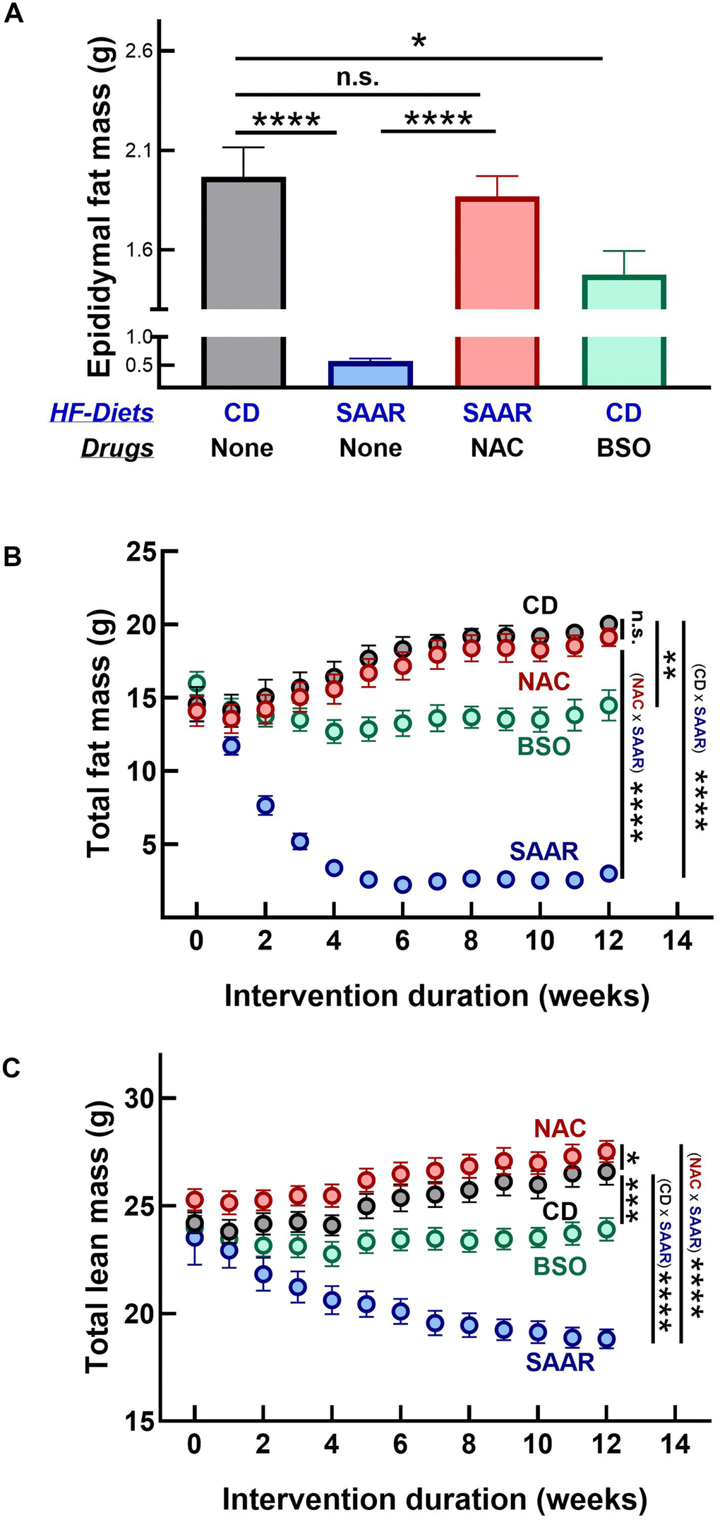 Contrary to its similar effect on hepatic lipid droplet frequency, BSO did not decrease the adipocyte area in the epididymal fat depot, while the SAAR diet exerted a strong effect (SAAR – 37% of CD, Figure 4E, 4F). However, similar to the reversal of the SAAR-induced decrease in hepatic lipid droplet frequency, NAC reversed the decrease in adipocyte area in the epididymal fat depot (Figure 4E, 4F). While BSO did not affect the adipocyte area in the epididymal fat, it decreased the epididymal fat weight, although to a lesser extent than the SAAR diet (BSO-75% of CD, SAAR-29% of CD, Figure 5A). BSO decreased not just the epididymal fat depot weight, but also total body fat mass compared to CD mice (72% of CD, Figure 5B). The SAAR diet exerted a rapid and much stronger effect on the body fat mass than BSO (15% of CD). The time-related effects of the SAAR diet and BSO on body fat mass were similar to their effects on total body weight (Figures 1B, 5B), indicating that a significant portion of changes in body weight were due to changes in fat mass. The effect of BSO and the SAAR diet on body composition differed, at least in two aspects. Mice on the SAAR diet had much lower total fat mass after the intervention than at the baseline (21% of baseline, Figure 5B), while it remained similar in BSO mice. Notably, BSO did not decrease the total lean mass compared to the baseline, while the SAAR diet decreased the total lean mass by 80% of the lean mass at the baseline (Figure 5C). On the other hand, mice on NAC accrued fat mass and lean mass at the same rate as the CD mice (Figure 5B, 5C).