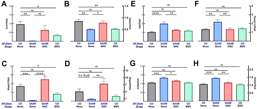 Changes in body composition indicate that BSO might only prevent further weight gain while the SAAR diet induces weight loss. To investigate if our assumption was valid, we quantified the mRNA of proteins involved in lipogenesis and lipolysis. mRNA data show that both the SAAR diet and BSO decreased the expression of lipogenic genes (Scd1, Gpam, Mogat1, and Mogat2, Figure 6A–6D). In contrast, only the SAAR diet increased the expression of lipolytic genes (Atgl, Ppargc1a, Arl8b, and Hadhb, Figure 6E–6H). Like its effect on the rest of the markers, NAC reversed the SAAR-induced expression of all these genes (Figure 6).