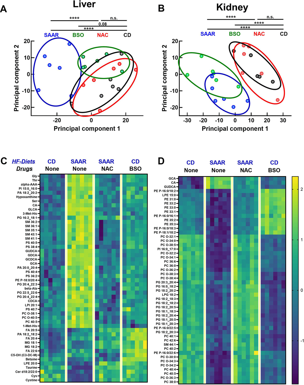 We used targeted metabolomics to understand the broader metabolic impact of BSO and its similarities with the SAAR diet. Principal component analysis (PCA) revealed three clusters in the liver: the first belonged to the CD diet and NAC, the second to the SAAR diet, and the third to BSO (Figure 7A). PCA data from kidneys clustered into two distinct patterns, consisting of CD and NAC in the first one, and the SAAR diet and BSO in the second one (Figure 7B). The closer clustering of the BSO group with the SAAR diet in the kidneys than in the liver was concordant with the stronger effect on tGSH in kidneys than in the liver. Consistent with the trends in the PCA, the heatmaps of the top fifty metabolites with the most significant P-values show that changes in the SAAR diet and BSO are more similar in the kidneys than in the livers (Figure 7C, 7D). Many of these top fifty compounds were amino acids, bile acids, and different species of lipids. Overall, the data show that the BSO-induced metabolomic changes in the kidneys are similar to those in the SAAR diet.