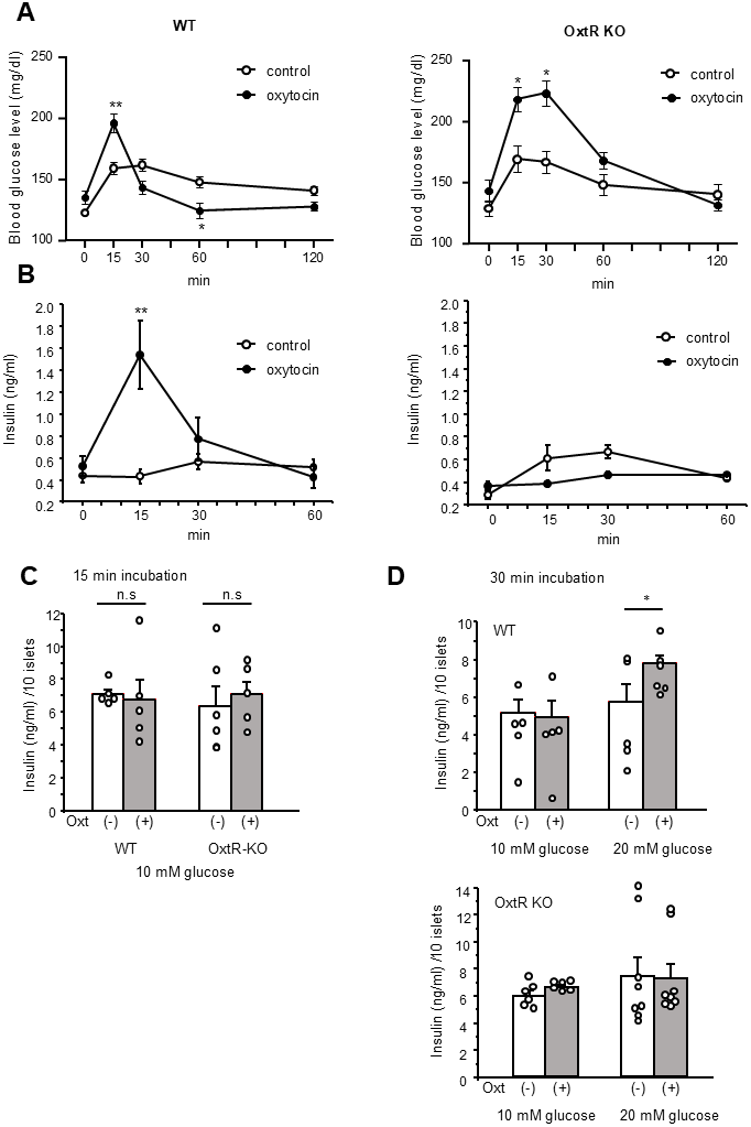 The results indicate that the effect of Oxt injection on increasing blood glucose levels at t = 15 min is independent of the OxtR mediated Oxt signalling pathway. Additionally, since insulin levels were increased only at 15 min after IP injection of Oxt in wild type mice, the reduction in blood glucose levels at t = 30 and 60 min observed only in wild type mice should be attributed to the elevated insulin levels induced by the Oxt IP injection.