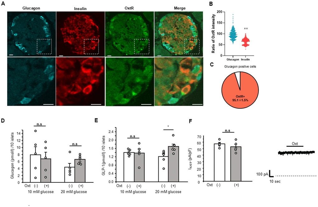 First, we have investigated the possible involvement of glucagon secretion. As shown in Figure 2A, OxtR KO are expressed in both insulin and glucagon positive cells, and histological study showed the intensities of OxtR KO were higher in glucagon positive cells than insulin positive cells (Figure 2B), indicating the abundant expression of OxtR KO on glucagon secreting pancreatic α-cells. 95.1 ± 1.5 % of glucagon positive cells were found to be positive with OxtR KO (Figure 2C). Therefore, we have applied Oxt for 30 min to islets under 10 mM and 20 mM glucose conditions in islets isolated from WT mice. However, Oxt failed to affect glucagon secretion in both glucose conditions indicating that Oxt has no direct effect on glucagon secretion (Figure 2D), regardless of glucose level.