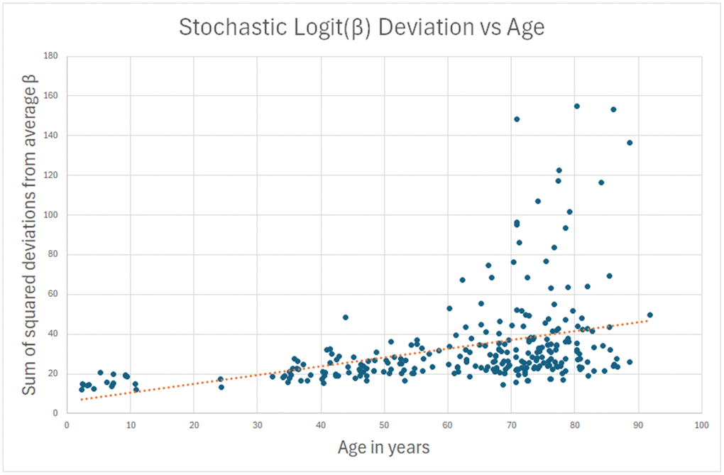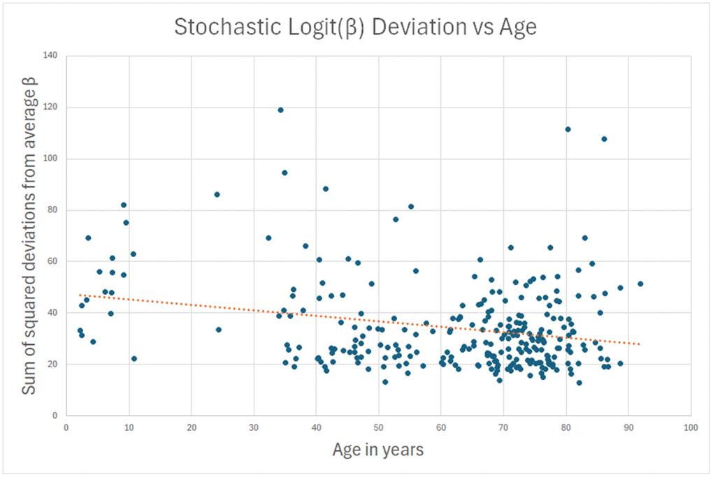 My hypothesis was that for the remaining 90%, the measured methylation disparity represents measurement error. To test this hypothesis, I repeated the analysis for sites where standard deviation of methylation decreased (young to old) over a lifetime, and the decrease was more than 10x the absolute change in average logit(β). There is no biological or physical reason why methylation should “undrift” over a lifetime, becoming less stochastic with age. Hence, the data in this analysis can safely be assumed to be measurement error. This second reverse-stochastic pseudo-clock (Figure 2) showed scatter comparable to the 90% in the true stochastic clock, and correlation with age of -0.25.
