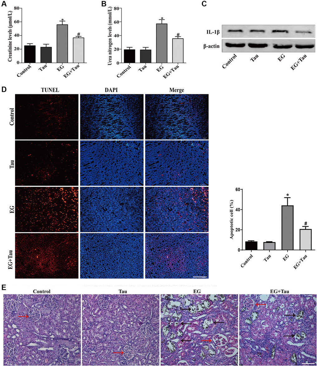 Tau attenuates EG-induced renal damage and crystal deposition in rat kidneys. (A) Effect of Tau on the serum expression of creatinine after EG-induced renal injury. (B) Effect of Tau on urea nitrogen following EG-induced renal injury. (C) Representative immunoblot and quantification analysis of IL-1β expression. (D) Renal tissue apoptosis was assessed by TUNEL staining; scale bar: 200 µm. (E) Kidney injury and crystal deposition were determined using Von Kossa-staining. Red and black arrows indicate glomerulus and crystal deposition, respectively; scale bar: 200 µm. Data are presented as the mean ± SD (n = 3). *P < 0.05 versus the control group, #P < 0.05 versus the EG group.