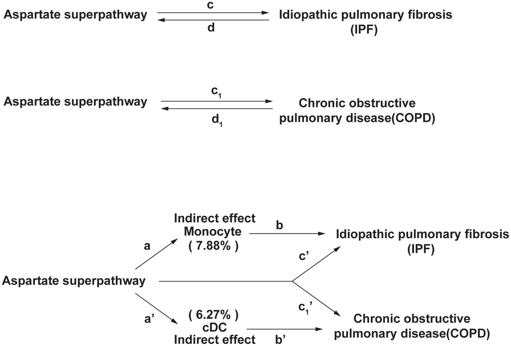 Our mediation effect analysis revealed specific insights. For IPF, the direct effect of the aspartate super pathway was calculated as -0.0009240468. Additionally, the analysis indicated that 7.88% of the effect was mediated through monocytes (direct effect=-7.908946e-05). Conversely, in the context of COPD, the direct effect of the aspartate super pathway was -0.1208708. Notably, 6.27% of this effect was mediated via cDC (with an indirect effect of 0.81%).