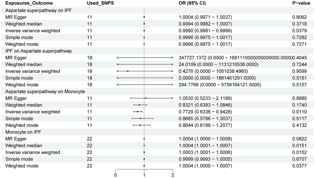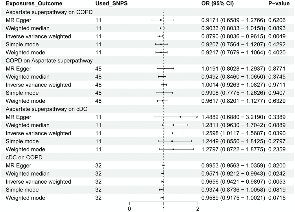 IVs were selected based on their close relationship with the exposure factor, exclusive effect on the outcome through the exposure factor, and independence from any confounders. IVs were chosen at a significance level of 1 × 10-5, and weak and chained imbalance variables were removed. A total of 11 IVs related to the aspartate superpathway, 48 COPD-related IVs, 18 IPF-related IVs, 32 cDC-related IVs, and 22 monocyte-related IVs were selected.