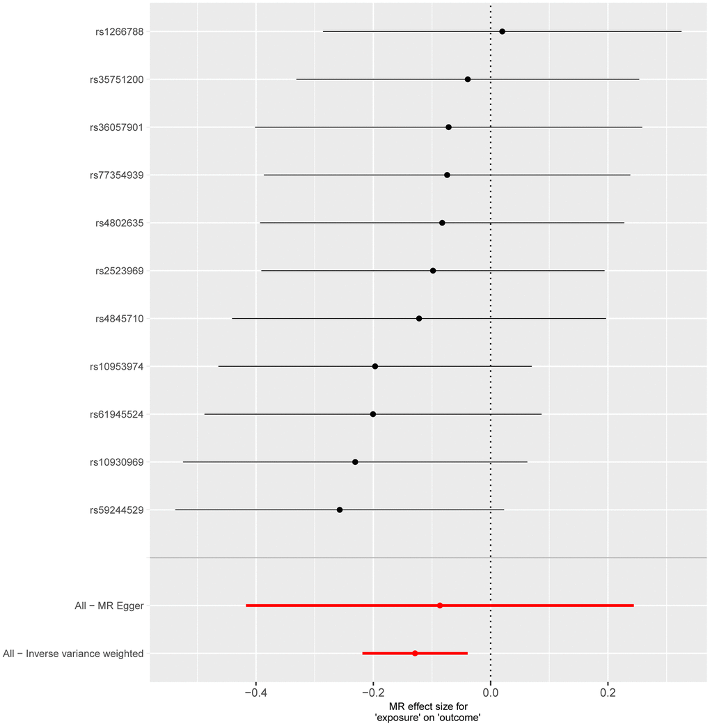 Following a predefined screening protocol and after excluding confounding factors and irrelevant SNPs, we identified 11 SNPs for further analysis. The Mendelian Randomization (MR) analysis indicated that the aspartate superpathway constitutes a protective factor for Chronic Obstructive Pulmonary Disease (COPD). Notably, there was a statistically significant difference between the results obtained from different IVW algorithms (p-value < 0.05). However, the remaining four algorithms exhibited consistent directional effects. Specifically, the IVW analysis yielded an odds ratio (OR) of 0.879, with a 95% confidence interval (CI) of 0.8036-0.9615 (Figure 4). Detection of horizontal pleiotropy and heterogeneity was further confirmed through MR-Egger and IVW analyses (Figure 5).