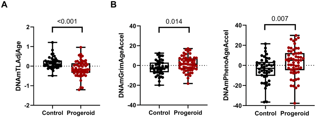 To investigate whether progeroid syndromes have telomere attrition, we calculated telomere length using the DNAmAge web-based calculator. This epigenetic calculator can estimate DNAmTL and several epigenetic ages, such as HorvathAge, HannumAge, GrimAge, PhenoAge, and SkinBloodAge, using DNA methylation data from blood. We calculated the residual of regressing DNA methylation telomere length on actual age to evaluate telomere attrition. At the same time, we calculated the residual of regressing the various epigenetic ages on actual age to assess age acceleration. As a result, significant telomere attrition was observed between the combined progeroid syndromes and their age and gender match controls (p-value < 0.001, Figure 1A). In addition, we found a significant age acceleration using GrimAge and PhenoAge between the controls and progeroid groups, as shown in Figure 1B.