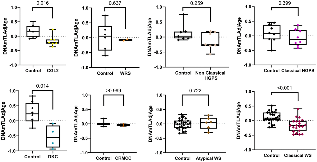 We acknowledge some limitations in our current research study. First, the heterogeneity of our DNA methylation data included in this study. We collected publicly available DNA methylation data from multiple sources. The limited sample size is also considered one of the limitations of this study, which decreases the statistical power of our analysis. However, the rare incidence of the studied syndromes severely limits the number of diagnosed patients worldwide and, consequently, the availability of biological samples for validation purposes; for example, DKC is a very rare syndrome that influences 1 case per 1,000,000 individuals [40]. HGPS is also rare, with an estimated incidence of only one case in every 4 to 8 million newborns [41], and CGL2 is similarly uncommon, occurring in roughly one out of every 10 million individuals [42]. Finally, one limitation lies in the epigenetic calculator's inherent constraints to estimate the shortest telomeres’ length, which triggers replicative senescence [43–45]. This limitation is of particular interest as the length of the shortest telomeres determines cell fate through cellular senescence [45]. However, our methodology also has notable strength, specifically the ability to estimate the telomere length of large publicly available DNA methylation datasets [43].