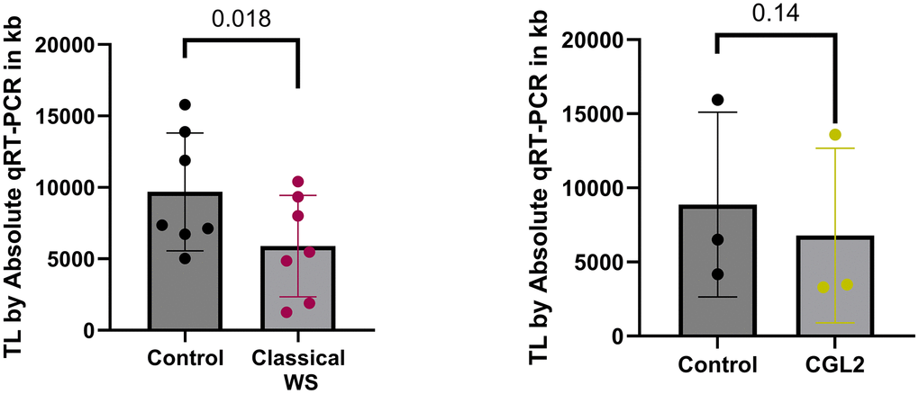 To validate changes in telomere length, we used the Absolute Human Telomere Length Quantification qPCR Assay Kit (ScienCell Research Laboratories, CA, USA). We confirmed significant telomere length shortening in patients with Classical WS (N=7) carrying homozygous mutations in the WRN gene, compared to age and gender-matched controls (p = 0.018, N=7) (Figure 3). However, in CGL2 patients, the tendency of telomere attrition was weaker (p = 0.14, Figure 3) due to the low number of samples (N=3) available for validation, as shown in Supplementary Table 2.