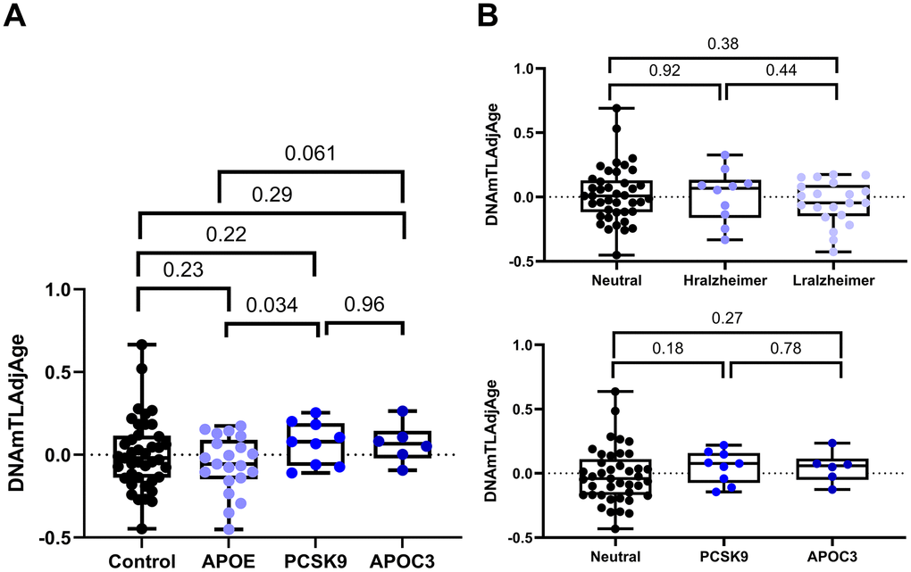 Additional data from our laboratory from individuals with known protective variants against premature aging disorders such as Alzheimer's and cardiovascular diseases were also included in this study. These protective variants are located within the APOE ε2, PCSK9 [PCSK9 p.Cys679*], and APOC3 c.55C>T (p.Arg19*) genes. As controls, 41 age and gender-matched samples who are carriers of the APOE ε3 allele were included. APOE ε3 allele is considered a neutral allele with no effect on the risk of developing Alzheimer's disease (AD).