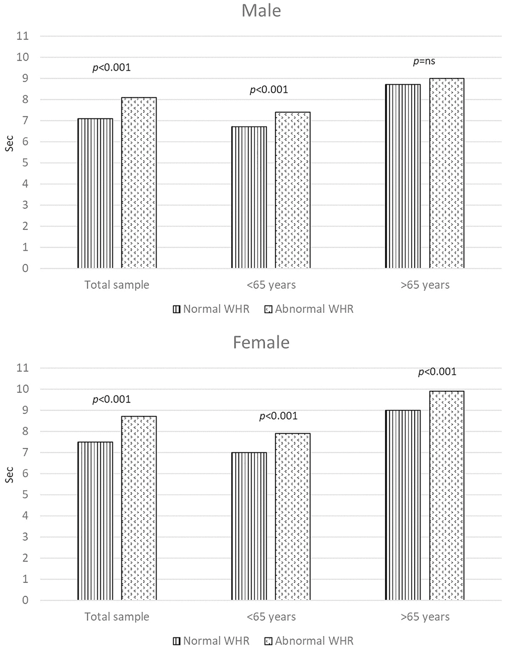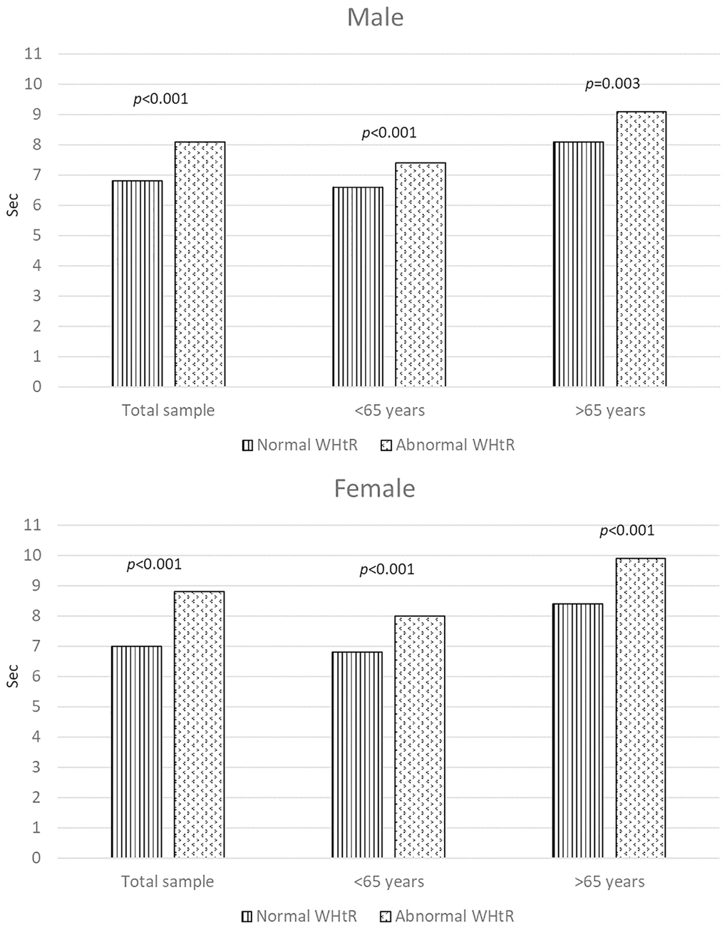 Figure 1 displays the adjusted outcomes derived from ANCOVA models, revealing variations in physical performance between individuals with abnormal and normal WHR. Following adjustments for smoking habit, physical activity, healthy diet, BMI, systolic and diastolic blood pressure, cholesterol, and glucose levels, noteworthy differences in the duration taken to complete the five-repetition chair stand test across different WHR categories were evident. This trend remained consistent among both male and female participants, excluding men aged 65 years and older, where individuals with an abnormal WHR exhibited poorer performance. Figure 2 shows the variations in physical performance between individuals with abnormal and normal WHtR. Following adjustments for the same variables, distinct distributions in the duration taken to complete the five-repetition chair stand test across different WHtR categories were consistent across both male and female participants, regardless of age group.