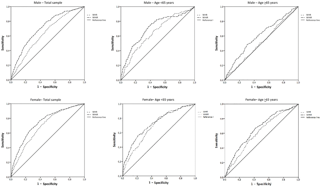 Finally, in order to evaluate the predictive capability of WHR and WHtR (independent variables) for indicating poor physical performance (dependent variable), receiver operating characteristic (ROC) curves were constructed. The resulting area under the curve (AUC) was reported, and the sensitivity and specificity at the respective WHR and WHtR thresholds were determined.