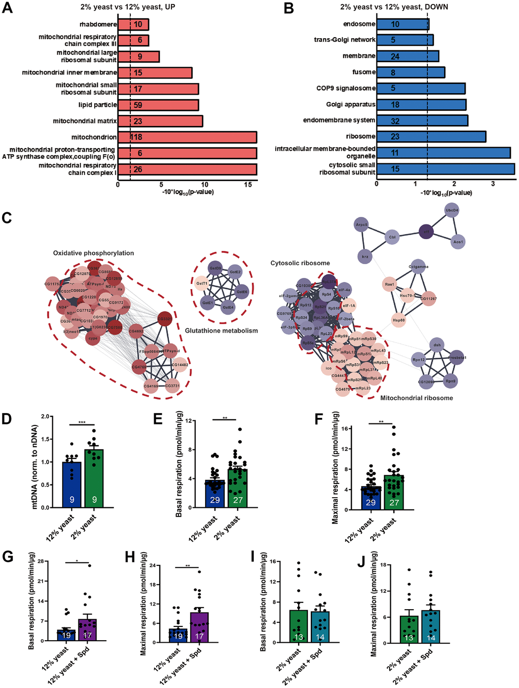 Subsequent protein network analysis showed that a big cluster of proteins involved in oxidative phosphorylation and mitochondrial ribosome increased, while a small cluster of proteins involved in glutathione metabolism decreased (Figure 1C). Our findings are consistent with the increase of various nuclear encoded electron transport chain and mitochondrial ribosomal protein mRNAs upon DR in a polysome profile of whole Drosophila [38].