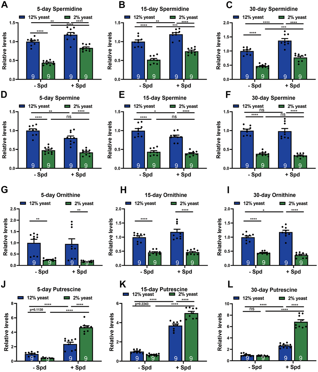 To monitor spermidine (Spd) levels in relation to the organismal effects on longevity associated with 2% versus 12% yeast rearing, and to validate the bioavailability of Spd-S across different protein conditions, we first assessed whole-organism Spd concentrations. We found that Spd levels decreased under 2% yeast rearing compared to 12% yeast rearing in age-matched groups (Figure 2A–2C). Other Spd precursors, such as spermine and ornithine, were also reduced in flies reared on 2% yeast (Figure 2D–2I). Given that ornithine is a direct product of arginine metabolism within the urea cycle, which converts excess ammonia generated from amino acid turnover [40], elevated Spd levels observed in 12% yeast-reared flies may reflect or result from increased protein and consequently amino acid intake.