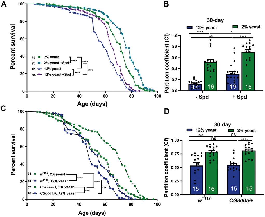 Jr , Jones DL, Walker DW. Modulation of longevity and tissue homeostasis by the Drosophila PGC-1 homolog. Cell Metab. 2011; 14:623–34. https://doi.org/10.1016/j.cmet.2011.09.013 [PubMed] - 88. Magnes C, Fauland A, Gander E, Narath S, Ratzer M, Eisenberg T, Madeo F, Pieber T, Sinner F. Polyamines in biological samples: rapid and robust quantification by solid-phase extraction online-coupled to liquid chromatography-tandem mass spectrometry. J Chromatogr A. 2014; 1331:44–51. https://doi.org/10.1016/j.chroma.2013.12.061 [PubMed]