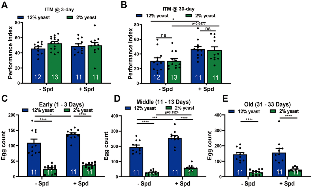 Fecundity experiments were carried out similarly to the procedures described by Krittika and Yadav with minor adaptations [91]. Wild type flies were reared on either 2% yeast or 2% yeast supplemented with Spd, as previously designated. 1-day-old F1 generation flies were collected upon hatching. Pairs consisting of 10 females and 10 males were placed in vials under four different dietary conditions as follows: flies reared on 2% yeast were placed on 2% and 12% yeast respectively, and flies reared on 2% + Spd were placed on 2% + Spd and 12% + Spd food respectively. Egg counts commenced on day 1 and continued through day 33. During this period, egg counts were assessed over four developmental stages, each monitored for three consecutive days: early (days 1-3), mid (days 13-15), late (days 21-23), and old (days 31-33). Eggs were counted at 9 AM and 5 PM, with flies being transferred to fresh food at each count. More flies of the same condition were aged in parallel to always ensure a constant number of 10 pairs. Data were pooled from three independent experiments, with 11 data points per dietary condition, yielding an n of 110 female and male pairs. Egg counts were normalized to the counts from the 12% food group at each developmental stage.