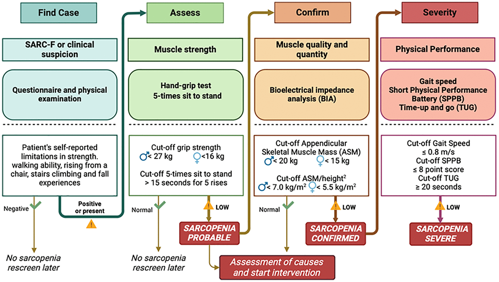 - 1. Cruz-Jentoft AJ, Bahat G, Bauer J, Boirie Y, Bruyère O, Cederholm T, Cooper C, Landi F, Rolland Y, Sayer AA, Schneider SM, Sieber CC, Topinkova E, et al, and Writing Group for the European Working Group on Sarcopenia in Older People 2 (EWGSOP2), and the Extended Group for EWGSOP2. Sarcopenia: revised European consensus on definition and diagnosis. Age Ageing. 2019; 48:16–31. https://doi.org/10.1093/ageing/afy169 [PubMed]