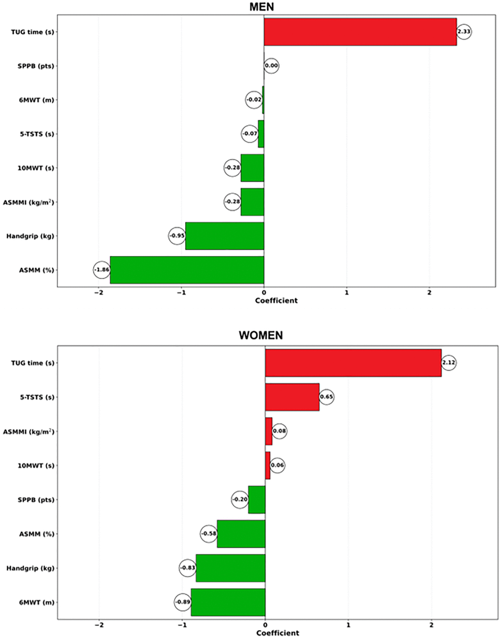 Derived from the penalised elastic net model, Muscle Age was significantly correlated with chronological age (r = 0.645; p < 0.001). Figure 2 displays the sex-based contributors based on the results of the motor-functional tests recommended by EWGSOP2. The contributions of each test in accelerating (red bars) or decelerating (green bars) the ageing trajectory are reported as coefficients indicating the standardised weight of each test in the construction of the biological/Muscle Age. Coefficients equal to zero indicate no contribution to the ageing measure. Being standardised, the weights can be read as the increase in Muscle Age for each increase by one standard deviation of the corresponding test result. Positive coefficients/weights indicate motor tests whose results are higher in an individual with higher Muscle Age and vice versa. Parsimonious modelling to retain only those features mostly contributing to the estimation of MAA extracted TUG (β = 2.93; 2.48- to −3.51), ASMM (β = −2.23; −2.99 to −1.67) and Handgrip (β = −1.12; −1.70 to −0.42) for men, and TUG (β = 2.69; 1.96 to 4.19), Handgrip (β = −1.27; −1.56 to −0.98), and Six-MWT (β = −1.15; −1.71 to −0.53) for women. RMSE and R2 of these parsimonious models were RMSE = 5.56 ± 0.90, R2 = 0.42 ± 0.17 for men, and RMSE = 5.43±0.65, R2 = 0.35 ± 0.16 for women.