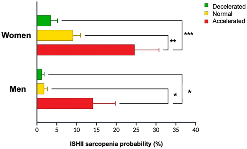 Comparisons among the three MAA categories carried out by general linear model ANOVA on the whole cohort are detailed in Table 2. MAA could identify participants at higher risk for sarcopenia, as assessed by Ishii’s formula [9], with accelerated agers displaying 19% probability of sarcopenia, which proved significantly higher than normal (9%; p < 0.0001) and decelerated agers (2%; p < 0.0001). Sex-based comparisons showed higher probability of sarcopenia both in accelerated (14%) compared to normal (2%) and decelerated male agers (all p-values ≤ 0.03). The same applied to women (accelerated: 25%; normal: 9%; decelerated: 4%; all p-values ≤ 0.001) (Figure 3).