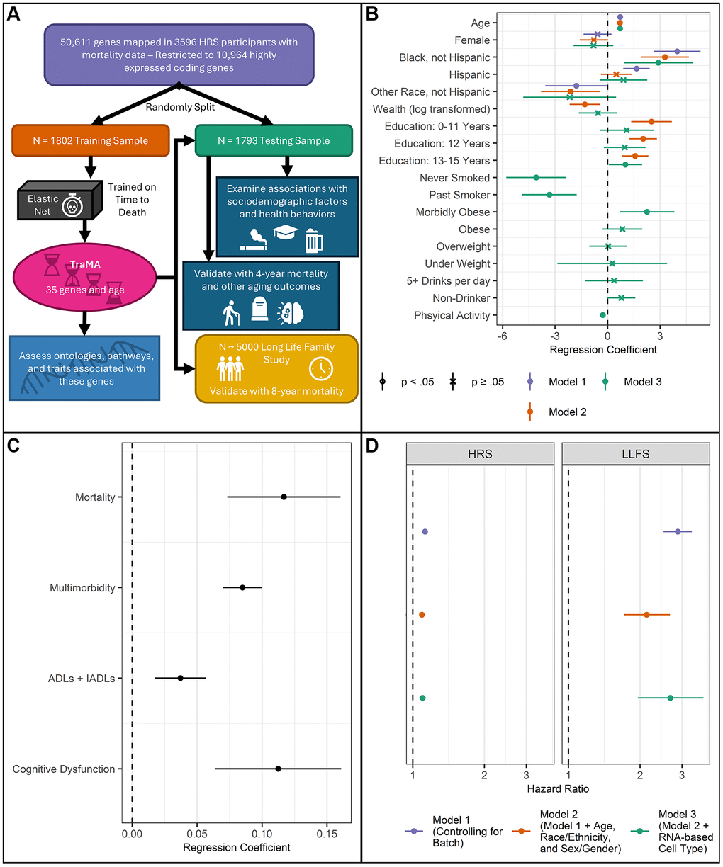 For these analyses to yield useful generalizable findings, a reliable and portable summary measure of accelerated transcriptomic aging is needed. We developed such a measure here using the 2016 HRS Venous Blood Study (VBS), a nationally representative sample of nearly 4000 US adults aged 50 and older. We utilized elastic net penalized regression to estimate a transcriptomic prediction measure of 4-year mortality risk—Transcriptomic Mortality-risk Age (TraMA)—using more than 10,000 gene transcripts in a training sub-sample. We evaluated this measure in a hold-out testing sub-sample of the HRS, in an external dataset (the Long Life Family Study; LLFS), and in several other publicly available datasets. Our plan of analysis for this study is shown in Figure 1A.