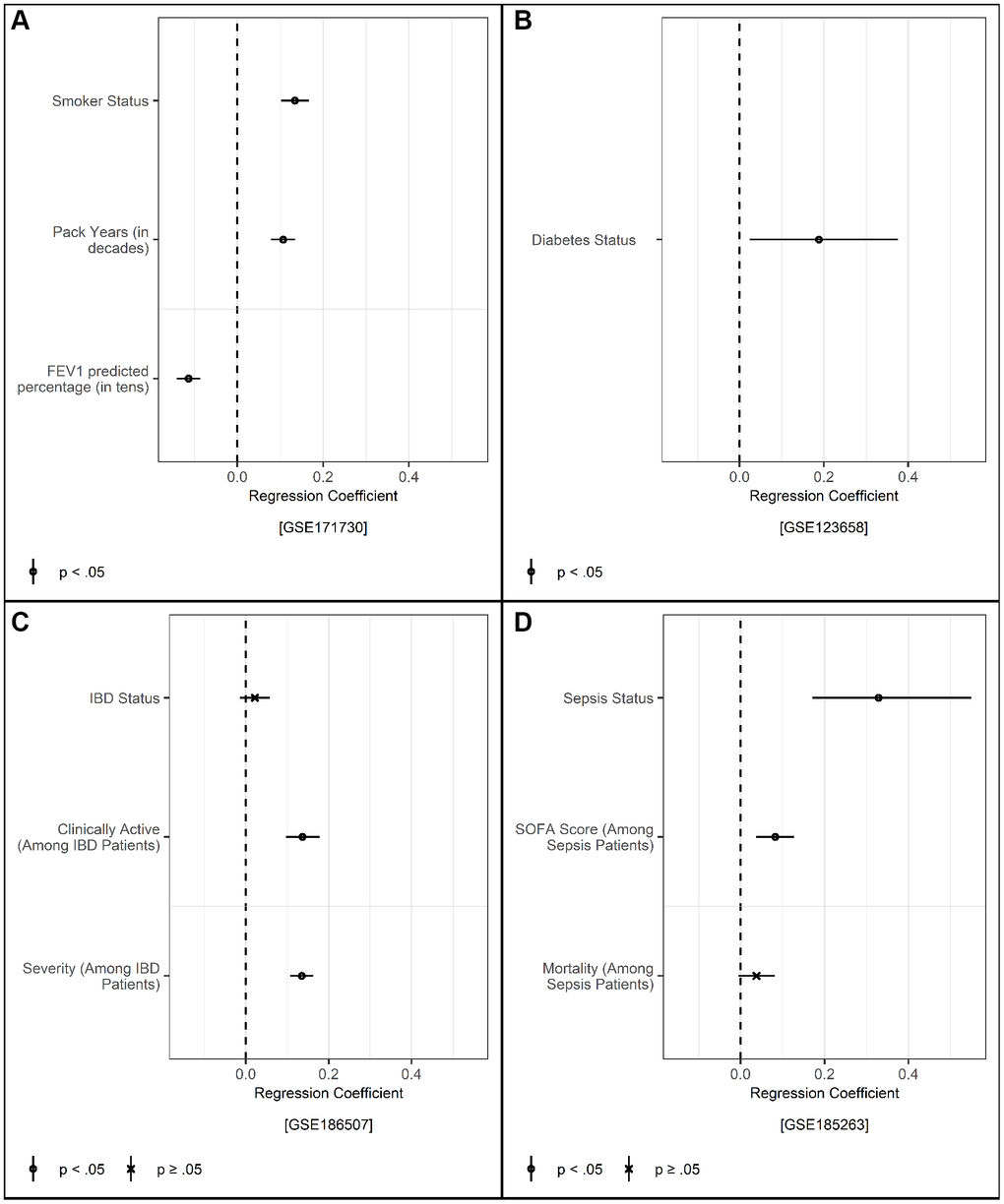 Validation in public datasets was conducted in R 4.4.0 “Puppy Cup” [56] using the tidyverse [57] and MASS [62] packages. For GSE171730, smoker status was analyzed using logistic regression, and pack years and FEV1 predicted percentage were assessed with linear regression. For GSE123658, diabetes status was assessed using logistic regression. For GSE186507, IBD status and active IBD status were assessed using logistic regression, and severity level was assessed using ordinal logistic regression. For GSE185263, sepsis status and mortality were assessed using logistic regression, and severity was assessed using linear regression.