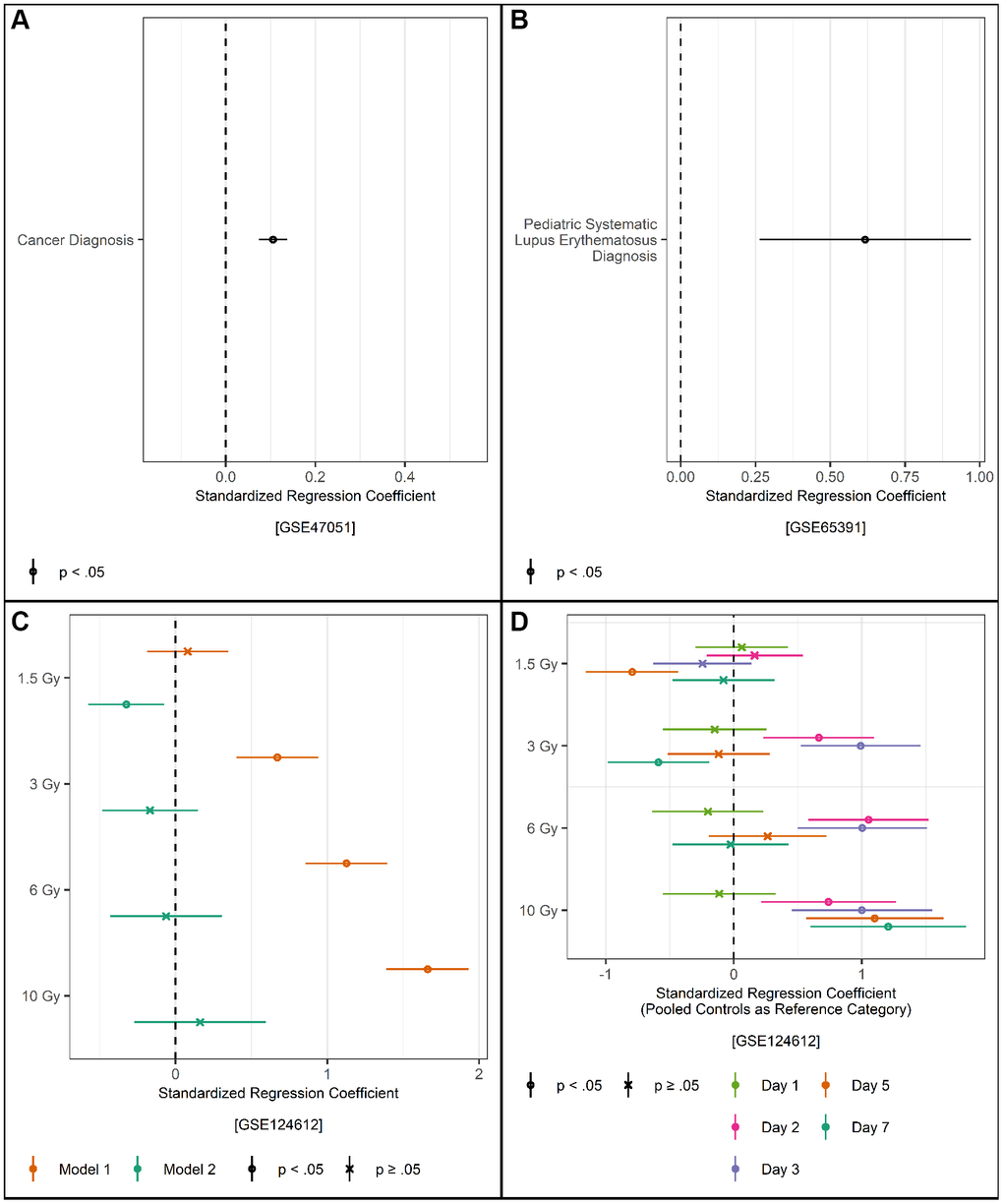 GSE124612 is a sample of male C57BL/6 mice exposed to 1.5, 3, 6 or 10 Gy of gamma-rays or sham irradiated controls and sacrificed at either 1, 2, 3, 5 or 7 days after exposure. 10 mice were in each experimental group except for 10 Gy on day 7, which only had 8 mice. RNA was profiled using the Agilent-026655 Whole Mouse Genome Microarray. Expression values were log2 transformed and missing values were set to the median. Mus musculus genes were matched to homologous Homo sapiens genes using biomaRt [37]. If an ensembl ID matched more than one probe, the mean of the values was taken. 15 of the 35 TraMA genes were available. Because the ages of all of the mice were equal, age was arbitrarily set 8 to calculate TraMA. Two of the genes used to indicate cell type were not available, so we only use CD3D, CD19, CD4, CD8A, and CD14 for these analyses.