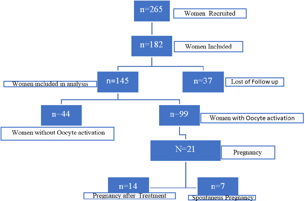 We recruited 265 women for the study, and 182 met the inclusion criteria (see Figure 1). However, follow-up data was lost for 37 women See Figure 2. Therefore, a total of 145 women were included in the final analysis, with an average age of 39 years (ranging from 26 to 44 years).