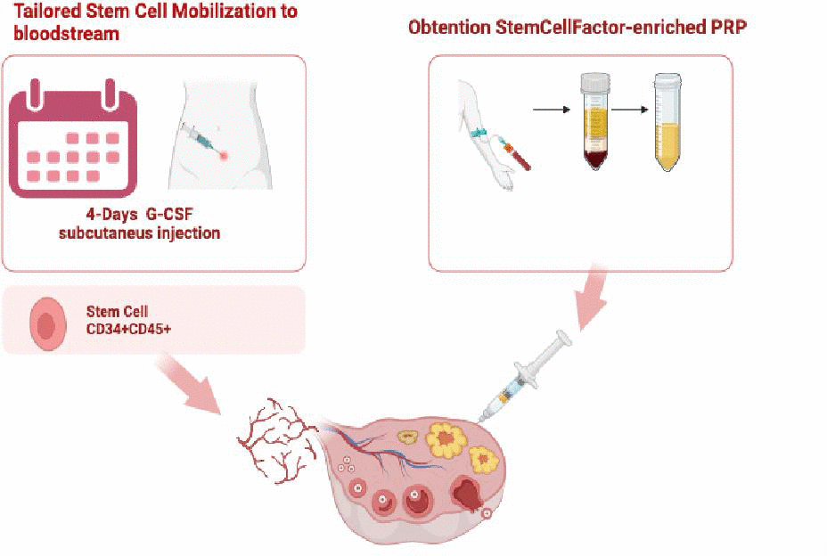 Based on these findings, the Stem Cell Regenera project was conducted. This treatment combines personalized G-CSF mobilization of Peripheral Blood hematopoietic Stem Cells with intraovarian injection of Stem Cell Factor-enriched (SCFE) PRP. The study aimed to assess the safety and effectiveness of the Stem Cell Regenera treatment for oocyte activation and ovarian regeneration in routine clinical practice.
