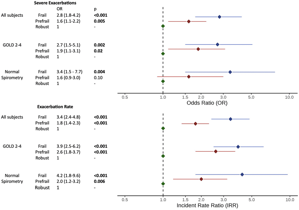 For longitudinal outcomes analyses, robust individuals were used as the comparator group for frail and prefrail individuals. Frequent and severe exacerbations were modeled using multivariable logistic regression. Exacerbation rate was modeled by multivariable negative binomial regression of total exacerbation count with an offset term of log(follow-up time) [48]. Exacerbation models were adjusted for participant age, sex, % predicted post-bronchodilator forced expiratory volume in 1 second (FEV1), and smoking status.