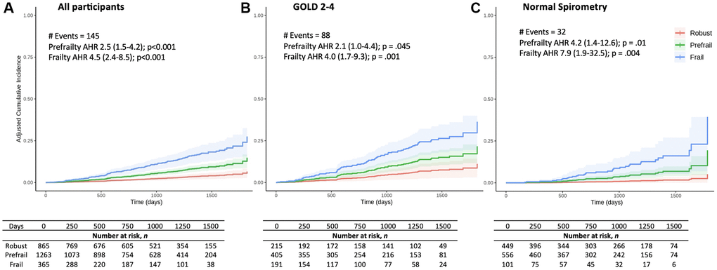 Multivariable Cox proportional hazards models adjusted for a priori covariates of age, sex, BMI, smoking pack-years, diabetes, and heart disease (defined in Supplementary Methods) were used to calculate adjusted hazard ratios (AHR) for frailty and prefrailty.