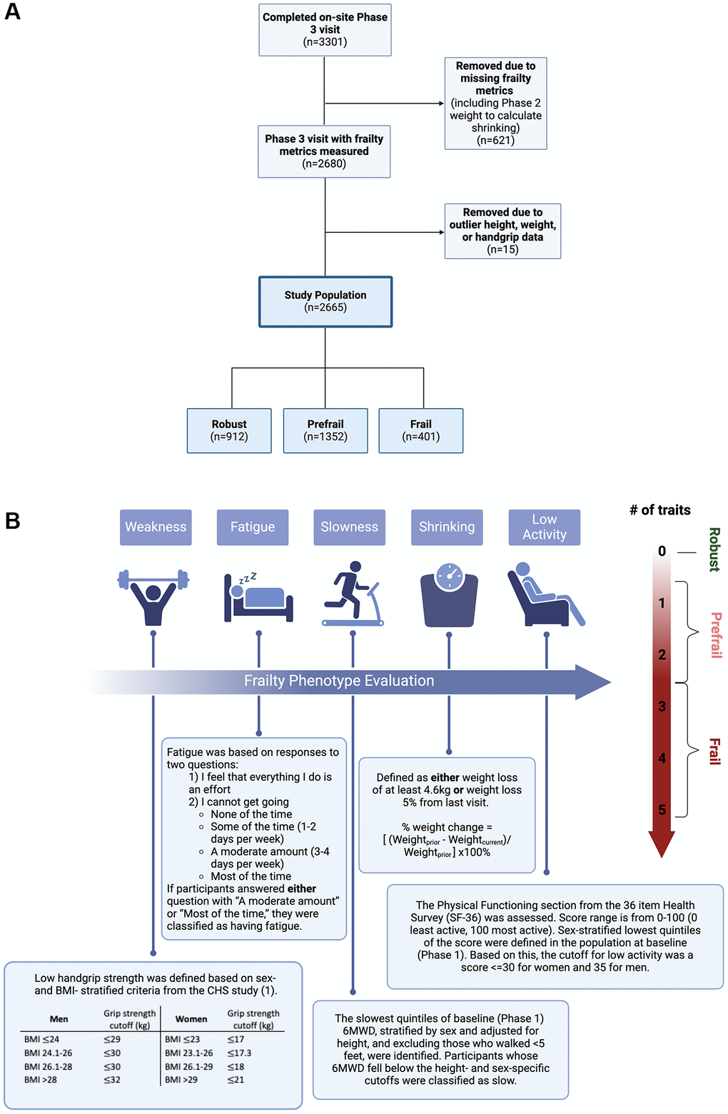 We generated a modified FFP from the five frailty components: shrinking, weakness, low activity, fatigue, and slowness (Figure 3) [1]. Shrinking was defined as weight loss ≥4.6 kg or ≥5% of body weight from the prior (Phase 2) visit [1]; weakness was based on hand grip strength (with sex- and BMI-stratified cutoffs [1]); fatigue was assessed with standard questions from the CES-D; slowness was defined by the lowest quintile of 6MWD in the baseline population (adjusted for sex and height); low activity was defined by the sex-stratified lowest quintile of baseline SF-36 Physical Functioning scores. Defining frailty components by the lowest quintile in the baseline population is established in the literature [1, 18]. Individuals were classified as frail if three or more of these components were present, prefrail if one or two were present, and robust if none were present [1].