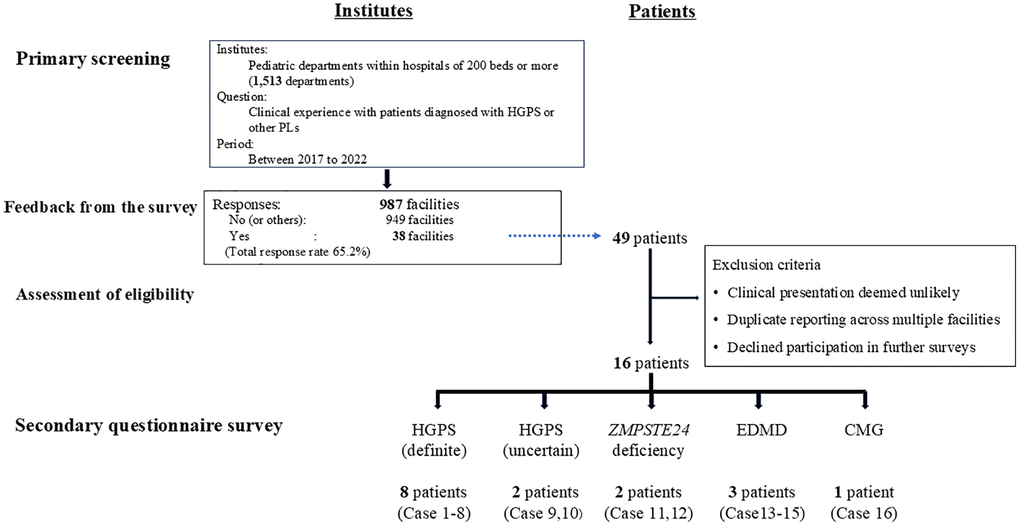 A national primary survey was conducted from July 2022 to March 2023 to evaluate the diagnostic experience with HGPS, suspected HGPS patients, and other PLs. The first questionnaire was delivered to 1,513 medical departments, including pediatric departments in facilities with at least 200 beds. The inclusion criteria were (1) hospitals with departments of pediatrics, neonatology, or genetics (individually or in combination) and at least 200 beds, (2) hospitals with genetics departments but without pediatrics or neonatology departments, and (3) specialized pediatric hospitals. Psychiatric and cancer hospitals were excluded from this study. The survey covered patients diagnosed or managed within the past five years from the time of the survey distribution. Facilities that had recently presented patient reports at academic conferences or had published studies were also included.