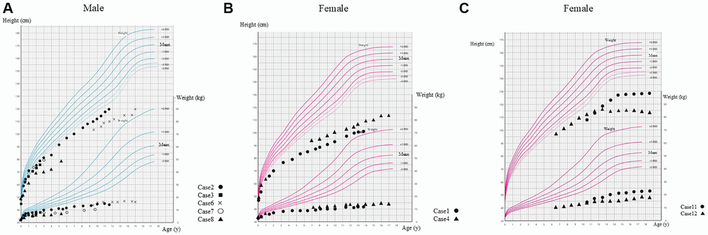 Prenatal healthcare data and growth curves of the patients indicated that birth weights were within the standard range, and growth retardation was not evident during early infancy. However, deviations from the standard growth curves appeared significant from 1 year of age (Figure 2A, 2B). Similar growth trajectories were estimated in patients with ZMPSTE24 deficiency (Figure 2C).