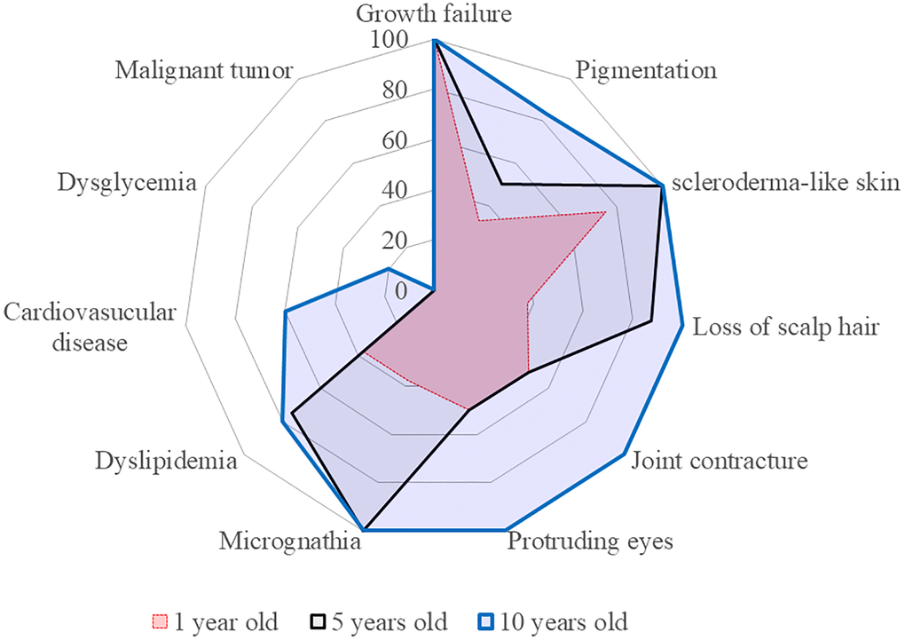 HGPS is characterized by progressive multisystem involvement resembling accelerated aging, including dermatological, skeletal, craniofacial, metabolic, and cardiovascular abnormalities. These symptoms generally become evident during infancy or early childhood, and intensify with age (Figure 3). All eight genetically confirmed patients demonstrated hallmark dermatologic changes, such as scleroderma-like skin thickening, alopecia, visibly dilated superficial veins, and subcutaneous fat atrophy. These findings typically emerge within the first year of life and remain stable thereafter. According to the radar chart, the dermatological manifestation of scleroderma-like skin thickening was observed in approximately 75% of patients at 1 year of age, with the prevalence reaching 100% prevalence at 5 years of age, supporting its value as an early diagnostic indicator.