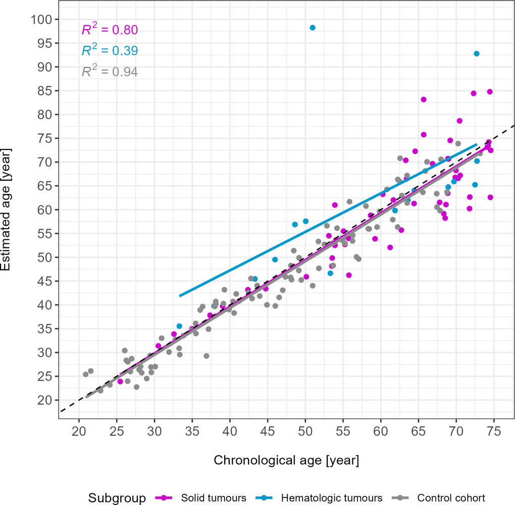 Interestingly, an analysis of the ME instead of the MAE showed that the age of solid tumour patients was predominantly underestimated, while the age of hematologic tumour patients was mostly overestimated. For solid tumour patients, these findings are counterintuitive and more samples, especially in younger patients, would be needed to evaluate whether this trend persists. For hematologic tumour patients, a slight age acceleration seems logical and is in line with previous research [30].