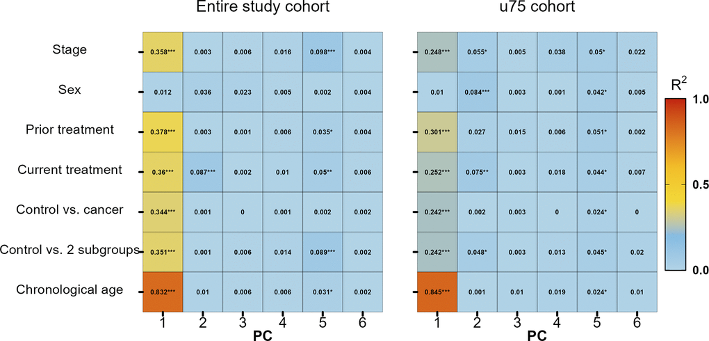 First, principal components (PCs) generated on beta values normalized for chronological age and their association with available meta data variables were assessed for both the entire cohort and the reduced u75 cohort (Figure 2). In the entire cohort, it is clearly visible that PC1 was the most affected of the first six PCs and that chronological age had the strongest influence (p-value = 2.29 × 10-79, R2 = 0.83). Still, all other variables except sex also had at least a moderate effect on PC1. When looking at the u75 cohort, the strong influence of chronological age on PC1 persisted (p-value = 2.64 × 10-70, R2 = 0.84), while all other variables showed weaker associations with this and all other PCs.