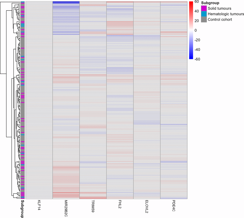 Further evidence for only weak differences between methylation beta values of the control and cancer subgroups, independent of cancer, stage or treatment was obtained by a heat map (Figure 3). Methylation beta values were statistically adjusted for the respective chronological age via linear regression. Only two cancer patients (one solid cancer and one hematologic cancer) were identified to have considerably different beta values in the MIR29B2C target site. One of them even clustered apart from all other samples.