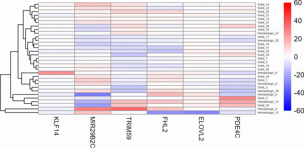 For this purpose, another heat map was generated using the age-corrected beta values of these 31 patients (Figure 4). Although no clear clustering was observed, it is noteworthy that the hematologic tumours seem to be slightly more similar in their beta values than the solid tumours. Interestingly, two hematologic cases (Cancer022 and Cancer041), both suffering from an acute myeloid leukaemia (AML), clustered apart from all other samples.