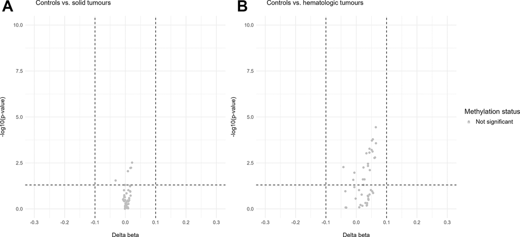 In addition, volcano plots were generated for the u75 cohort on the data of all 44 sequenced CpG sites, normalized for chronological age (Figure 5). The cancer cohort was again divided into solid and hematologic tumours for a more discriminative analysis of differentially methylated sites in the two different subgroups of malignancies. For neither of the two comparisons (solid vs. controls and hematologic vs. controls) differentially methylated sites were found.