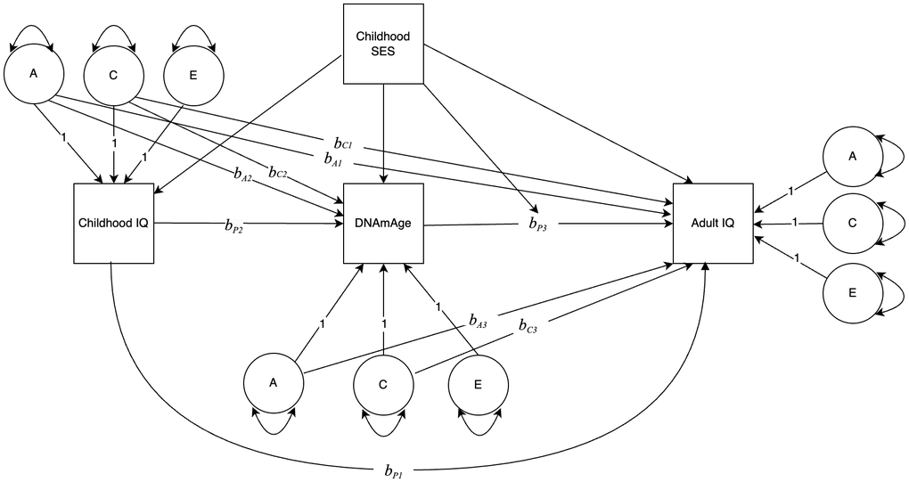 Finally, we fit the quasi-causal regression model to estimate the phenotypic regression coefficients conditional on bA and bC paths. The classical twin method was used to partition childhood IQ, adult IQ, and DNAmAge into A, C, and E components. In this case, adult IQ was regressed on childhood IQ, DNAmAge, and the A and C components of DNAmAge and childhood IQ, as illustrated in Figure 1. Childhood SES was used as a linear covariate for DNAmAge and the IQ variables. We also estimated an interaction between childhood SES and DNAmAge to determine whether the strength of the relationship between DNAmAge and ΔIQ depended on the SES of the family in which twins were raised. A statistically significant bP3 coefficient affirmatively answers the question: Within a pair of identical twins, does the twin with the higher DNAmAge value also have the larger positive or negative ΔIQ, statistically adjusting for the effects of the A and C components of DNAmAge (bA3 and bC3).