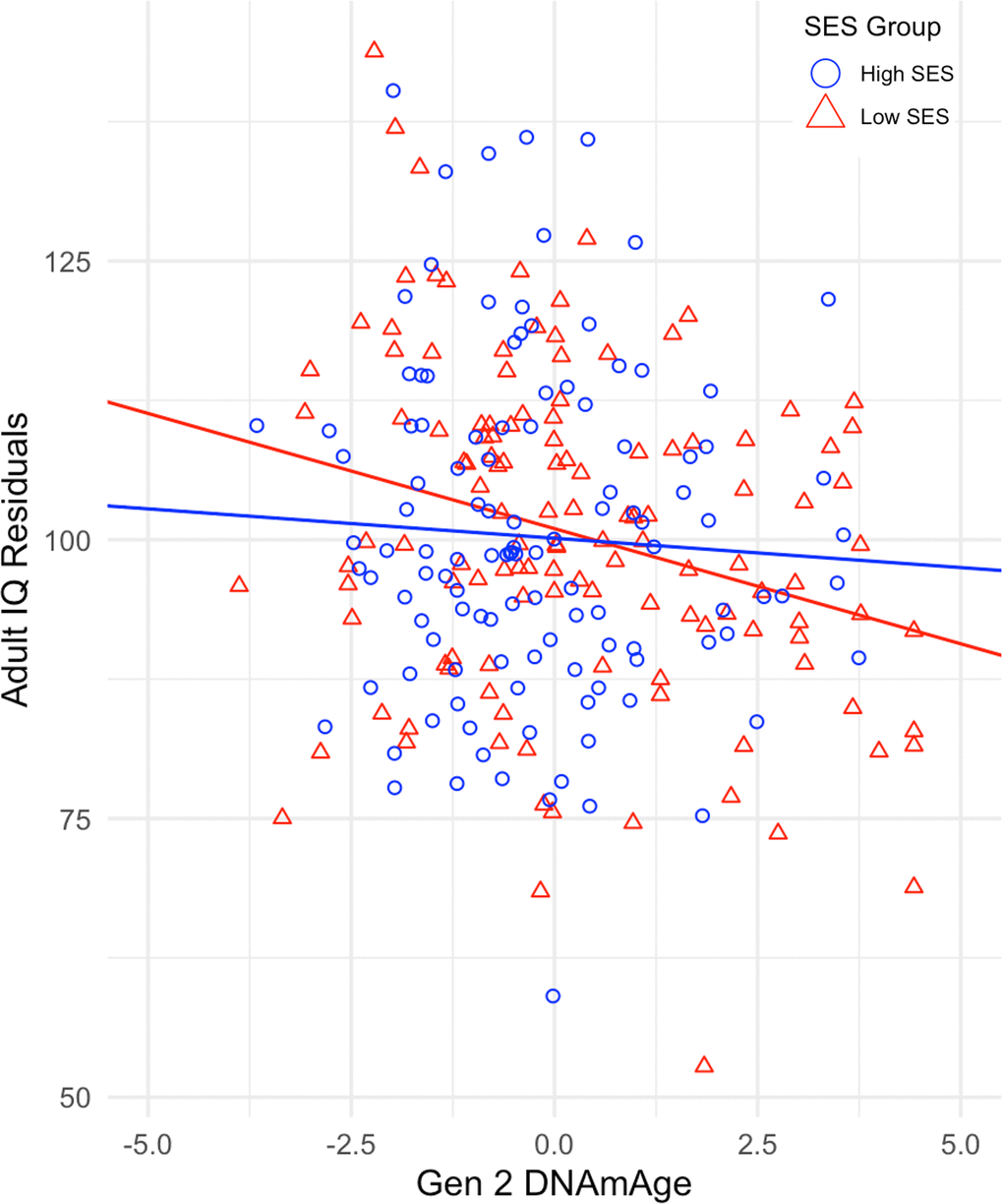 We then tested the interaction between DNAmAge and SES (bint) in the quasi-causal models. The interaction revealed that twins raised in lower SES families showed a more negative relationship between Gen 2 DNAmAge and ΔIQ (b = 0.07, SE=0.03, p <.05) (Table 2). Figure 2 illustrates the moderating effect of childhood SES by using a median split of our sample for SES and displaying the regression of adult IQ on Gen 2 DNAmAge in both high- and low-SES groups. The effect of DNAmAge on ΔIQ is greater in twins raised in lower SES households, indicating that socioeconomic disadvantage may be an early exposure that amplifies the negative effects of epigenetic aging on cognitive trajectories in midlife.