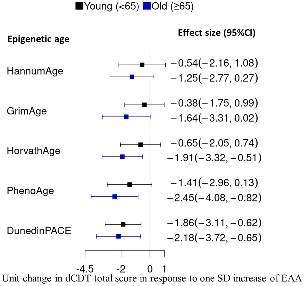 We conducted multiple secondary analyses to examine the robustness of our primary results. We first tested the association between DNAm age acceleration estimated by GrimAge version 2 and dCDT total score. Similar effect sizes and association direction were observed with DNAm age acceleration estimated by PC−based GrimAge version 1 (Supplementary Figure 4). Additionally, GrimAge version 2 showed a stronger association with dCDT total score in the older age group (beta = −2.0, FDR = 0.02) compared to PC−based GrimAge version 1 (beta = −1.6, FDR = 0.07) (Supplementary Figures 4–6). We further assessed if associations between dCDT total score and DNAm aging metrics differed by self−reported sex. No significant sex differences were observed in the association between dCDT total score and DNAm aging metrics (Supplementary Table 4). However, given its relevance as a biological variable, we conducted a sex−stratified analysis to explore potential variations. We observed similar effect sizes and directions of association between dCDT scores and all DNAm age acceleration measures in men and women. One minor difference was that DunedinPACE showed a stronger association with dCDT total score in males (beta = −2.3, FDR = 0.01) compared to females (beta = −1.7, FDR = 0.06) (Supplementary Figures 7 and 8).