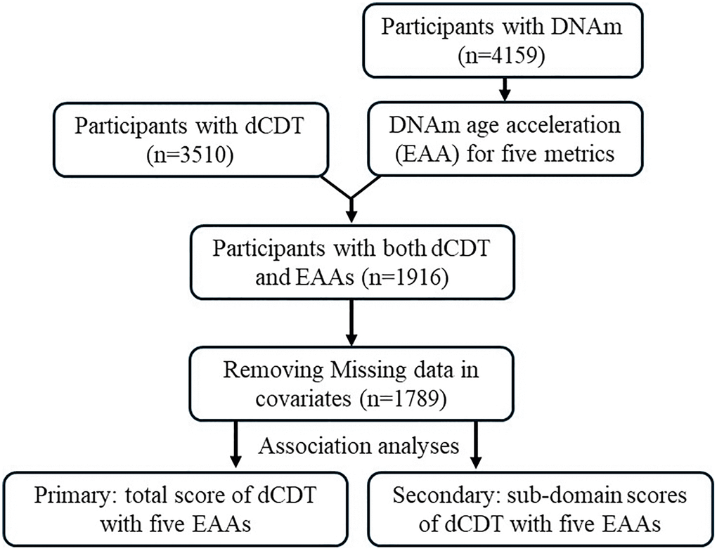 FHS, initiated in 1948, is a community−based longitudinal cohort study that has followed three generations of participants over time [50]. All participants underwent routine health assessments every two to six years [51, 52]. Our study included 1,264 participants from the Offspring cohort (Gen2) at exam 8 (2005−2008) and 688 participants from the Third−generation cohort (Gen3) at exam 2 (2008–2011), based on available DNAm measurements. We excluded participants whose blood samples were not collected at exam or who were not administered the dCDT (2011–2018). After excluding participants with covariates (e.g., age, self−reported sex, education, cell counts) missing, we included 1,789 participants (Figure 3) in our statistical analyses. For participants with multiple dCDT tests, we selected dCDT data closest to DNAm measurement dates for inclusion in our study.