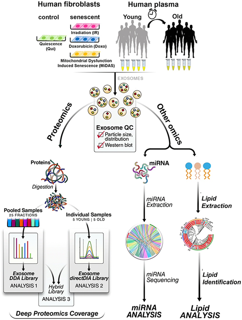 In this study, we developed a platform to enrich exosomes from plasma and tissue culture for the analysis of exosomal proteins, lipids, and miRNA (Figure 1). Additionally, we generated a novel “human exosome protein spectral library” using data-dependent acquisition (DDA) and performed data-independent acquisition (DIA) workflows for exosome protein quantification. This development introduces quantitative plasma exosome workflows, where DIA-MS acquisitions [23, 24] are searched efficiently in Spectronaut (Biognosys). Our study showed that senescent fibroblasts induced by three stimuli (IR, doxo, and Antimycin A-induced MiDAS) released highly complex and dynamic overlapping exosome profiles, some of which overlap with profiles we also observed in the human plasma exosomes from older individuals. Importantly, in exosomes from senescent cells we identified many categories of significantly changing proteins related to extracellular matrix remodeling and inflammation, which are both implicated in accelerating secondary senescence. Our study aims to address several critical knowledge gaps in the field of exosome-associated SASP, including identifying aging-specific exosome signatures, cell-specific contributions, and local versus systemic effects. We also explore molecular pathways through which exosomes propagate senescence, inflammation, and tissue remodeling. To advance this understanding, we optimized exosome isolation workflows from both cell culture and plasma, enabling robust multi-omics analyses. Our study has identified and quantified exosome cargo, including not only proteins but also significantly altered lipids and miRNAs. These findings enhance our understanding of exosome composition in aging and provide a foundation for developing senescence-targeted diagnostics and therapeutics to manage age-associated diseases and promote healthy aging.