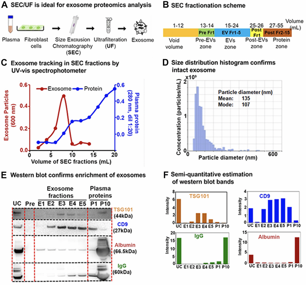To improve the purity of exosome enrichment for downstream processing we developed a robust workflow for exosome enrichment using sequential size-exclusion chromatography (SEC) followed by ultrafiltration (SEC/UF) or SEC followed by ultracentrifugation (SEC/UC; Supplementary Figure 1A). Both SEC/UC and SEC/UF yielded equivalent protein groups identification for exosomes by mass spectrometric proteomics analysis (Supplementary Figure 1B). With consideration for ease, time, and cost-effectiveness, we proceeded with SEC/UF for downstream proteomics and miRNA analysis (Figure 2A). The details of SEC elution and pooling strategies are provided in Figure 2B.