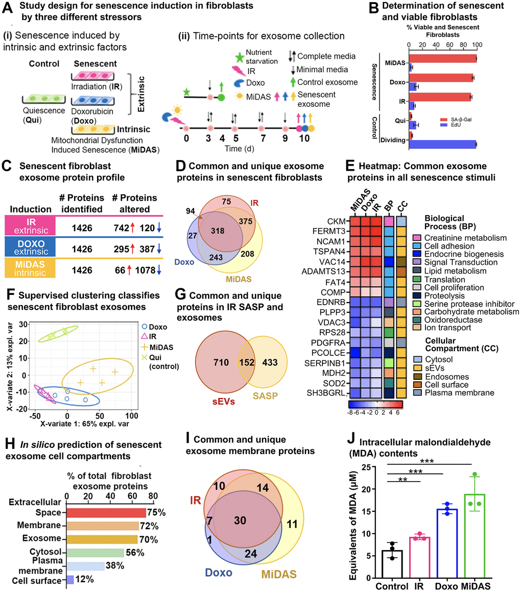 To evaluate the impact of different senescence stimuli on exosomal SASP proteins, we induced senescence in human primary fibroblasts by (a) Irradiation (IR), (b) doxorubicin (doxo), and (c) Antimycin A (MiDAS) (Figure 3A (i)). Either quiescent (Qui) or DMSO-treated (DMSO) fibroblasts were used as a control. Each senescence stimulus and the control group comprised four biological replicates. Figure 3A (ii) provides a detailed account of the exosomal SASP collection following senescence induction. Briefly, we induced senescence in fibroblasts by IR, doxo, or MiDAS and allowed 10 days for the senescent phenotype to develop as previously described [10]. In parallel, the control cells were brought into quiescence state (Qui) by incubating in 0.2% serum (minimal media) for 3 days by mock irradiation or treatment with DMSO in 0.2% serum for 1 day. Senescence-induced cells and control cells (Qui or DMSO) were cultured in serum-free medium for 1 day before collection of the conditioned media containing exosomal SASP components for the mass spectrometric end-point analysis. Cell viability assays confirmed no detectable difference in apoptosis/cell death in senescent and control fibroblast cells measured by SYTOX™ Green Nucleic Acid Stain (Supplementary Figure 3A). Furthermore, EdU and SA-β-Gal counter staining confirmed senescence (more than 90%) in IR-, doxo-, and MiDAS-induced senescent IMR90 cells compared to Qui control, while ~10% of senescent and Qui controls were dividing cells (Figure 3B). In MiDAS, mitochondrial dysfunction was observed by a decrease in NAD+/NADH ratio indicating the electron transport chain was inhibited (Supplementary Figure 3B).